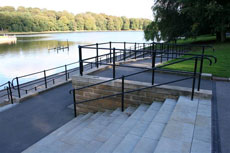 White Rose use the centre, ground floor section of the boathouse for canoe storage and also have access to the wet dock on the right of the boat house where safety boats and bellboats can be kept on the water but undercover. Leeds University and other rowers use the left side of the boathouse, a good example of where two sports can work harmoniously side by side. The low building with the wheelchair access ramp on the right houses toilets, changing rooms and a clubroom. With a restaurant on top of the boathouse, this is a high profile site for canoeing.